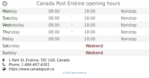 Please note that the information for Canada Post In Erskine, 1 Park St and all other Branches is for reference only.